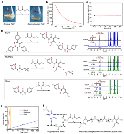 图2. 聚氨酯泡沫解聚及机理研究。(a)聚氨酯泡沫样品解聚前后的照片。(b-c)温度及乙酰乙酸乙酯(EAA)/聚氨酯泡沫质量比对解聚时间的影响。(d)缩二脲、氨酯和脲键与EAA反应产物的核磁共振氢谱分析。(e)缩二脲、氨酯和脲键的断键反应动力学。(f)聚氨酯泡沫化学解聚为可再加工聚合物的示意图。