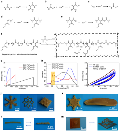 图3. 网络重构与光固化3D打印升级回收。(a-e)异氰酸酯(NCO)与脲键、氨酯键、羟基、插烯氨酯、乙酰乙酸化酰胺的反应。(f)以甲基丙烯酸异氰基乙酯(MAI)为接枝试剂,将解聚聚氨酯泡沫(PUF)化学转化为光敏树脂。(g)不同聚氨酯泡沫废料比例下光固化产品的应力-应变曲线及(h)动态热机械分析(DMA)曲线。(i)含89% PUF废料配方在90%应变下的循环拉伸曲线和恢复曲线。(j-k)含(j)80%和(k)89% PUF光固化3D打印产品(雪花、晶格结构、鞋垫)。(l-m)在外力作用下触发动态键交换(100°C,20分钟)实现再生材料的形状编程。