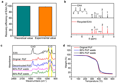 图4. 原子经济性分析。(a) 乙酰乙酸乙酯(EAA)的回收效率,展示了三个平行批次的理论值与实验值。(b) 初始及回收EAA的1H NMR谱图。(c) EAA、原始聚氨酯泡沫(PUF)、解聚PUF以及含80%和89% PUF再生产物的FTIR谱图。(d) 原始PUF及含80%和89% PUF再生产物的TGA曲线。