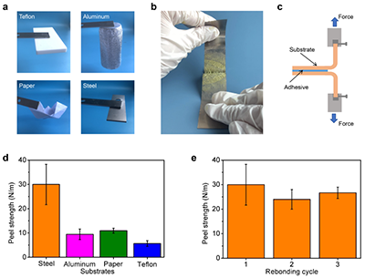 图5. 压敏胶应用。(a-b)解聚产物对聚四氟乙烯、铝、纸张和钢材基材的压敏粘附照片。(c-d)剥离强度测试。(e)解聚产物在钢材上三次循环剥离测试。