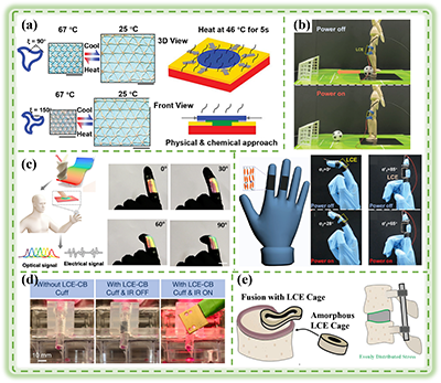 液晶弹性体(LCEs)是一类理想的刺激响应性智能材料,其特征在于将液晶分子的各向异性响应特性与轻度交联聚合物网络的机械柔韧性有机结合。在外界刺激作用下,该类材料可表现出可逆的形变行为及光学性质变化。通过协调液晶相的有序结构与弹性体基质的高弹性能,LCEs在仿生肌肉驱动的机器人假肢以及功能性组织再生等前沿领域展现出显著的应用潜力。凭借其优异的能量转换效率、本征刺激响应能力以及可编程的驱动路径,LCEs奠定了开发下一代自适应生物医学系统的重要基础。