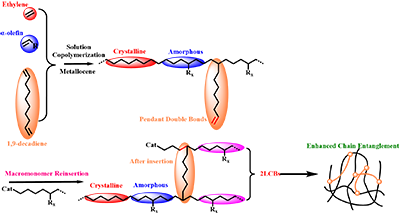 研究表明,在三元共聚过程中,1,9-癸二烯中双键参与链增长反应,而另一端双键则保留在聚合物侧链上,形成带有悬挂双键的大单体。在后续聚合过程中,这些大单体可以再次插入活性中心并继续增长,从而在主链上形成新的链增长位点,最终构筑出长支链结构。