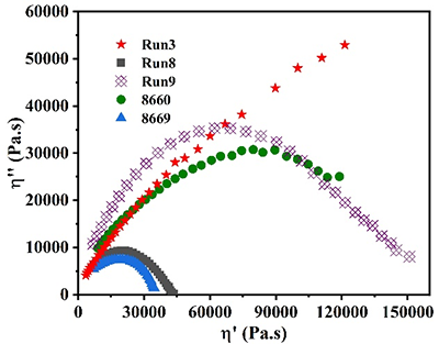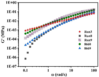 通过三检测凝胶渗透色谱(triple-detection GPC)及流变测试等手段,研究团队进一步验证了长支链结构的存在。结果表明,与传统POE相比,长支链POE表现出更高的零剪切黏度、更明显的剪切变稀行为以及更高的低频储能模量,这些特征均表明长支链结构能够显著增强聚合物熔体的弹性和加工稳定性。