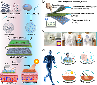 近年来,随着可穿戴设备和智能纺织品的快速发展,如何在柔性材料中同时实现温度监测、热管理与生物防护,成为该领域关注的核心问题。然而,现有研究大多侧重单一功能。电学传感虽灵敏但缺乏直观反馈,热致变色材料具备可视化优势却难以实现精准监测,多功能之间往往相互干扰,难以协同工作。