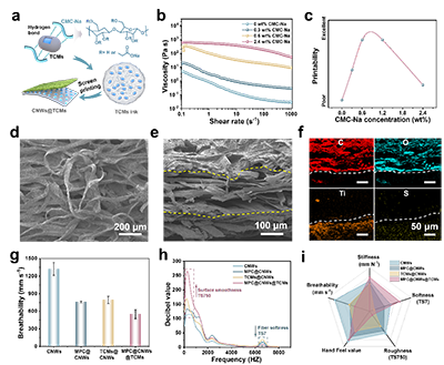 该团队通过胍基聚合物与氨基糖苷类抗生素成功开发出兼具抗菌与抗病毒活性的可穿戴纺织品(J. Adv. Res. 2022, 39, 147; J. Hazard. Mater. 2022, 424, 127391),并系统揭示了抗菌活性与抗菌剂结构、含量之间的关系。在此基础上,团队进一步利用具有优异导电性与机械性能的二维材料MXene,构建出具备热管理、电磁干扰屏蔽及抗菌性能的柔性纺织材料(J Mater. Chem. A 2022, 10, 17452; Int. J. Biol. Macromol. 2024, 266, 131080)。此外,团队还提出了MXene全值化利用策略,通过Zn2+插层与油墨化处理实现MXene的可印刷加工,制备出高灵敏度智能压力传感器及多功能防护材料(Adv. Funct. Mater. 2024, 2402707),为可穿戴设备提供了新的材料平台。进一步地,团队发展了可实现细菌检测与杀灭双功能的纤维素基智能纺织体系(Adv. Funct. Mater. 2025, e20327; Chem. Eng. J. 2023, 473, 145492; J. Bioresour. Bioprod. 2025, 10(3), 373),并在多功能MXene/纤维素复合体系方面取得系列成果(J. Colloid Interface Sci. 2024, 679, 510; Adv. Colloid Interface Sci. 2025, 346, 103658),为新一代智能可穿戴材料的设计与应用提供了新的理论基础与技术支撑。
