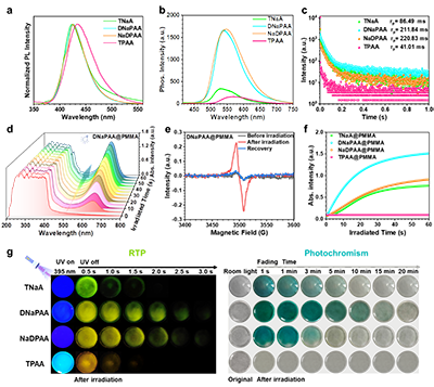 该团队设计并合成了四种三芳胺衍生物(TNaA、DNaPAA、NaDPAA、TPAA),分别引入不同数量的萘和菲取代基,并将其掺杂于聚甲基丙烯酸甲酯 (PMMA) 基质中构建主客体体系。实验结果显示,具有不对称分子结构的DNaPAA和NaDPAA在PMMA薄膜中表现出更长的室温磷光寿命 (分别达211.84 ms和220.83 ms) 和更显著的光致变色效应,薄膜由无色迅速转变为蓝绿色,其吸收波长在395 nm紫外光照射下可红移约230 nm,吸收强度最高可接近中性态水平。电子顺磁共振波谱证实,光生阳离子自由基是光致变色效应的直接来源。