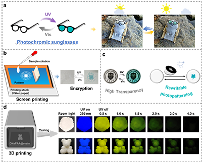基于该材料的优异性能,研究团队展示了多种应用场景,包括可逆光致变色太阳镜、丝网印刷防伪图案、可擦写信息存储以及光固化3D打印样品。这些应用充分体现了该材料在众多领域中的实用潜力。