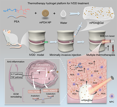 该治疗平台采用metoxy PEG-block-poly(L-alanine)(PEA)嵌段共聚物所形成的温敏水凝胶来负载介孔聚多巴胺(mPDA)纳米粒子,在微创注射后,可以精准对椎间盘(IVD)部位进行多次温和的光热疗。引入的mPDA纳米粒子发挥了双重的治疗益处——高效的光热转化和强有利的活性氧(ROS)清除效果,同时,水凝胶基质能在IVD内长期保留,从而在单次注射后实现了对病灶部位持续的热疗干预。该治疗平台不仅缓解了IVDD进程中非特异性疼痛症状,还干预了IVDD的核心病理进程,起到“治标治本”的作用。
