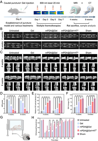 所合成的PEA聚合物在水中具有温敏特性,其水溶液在升温后能够发生溶胶-凝胶的相转变。负载mPDA纳米粒子的热疗水凝胶能够在15分钟内轻松完成制备,并且热疗水凝胶在凝胶状态下也表现出良好的可注射性,而这归功于体系剪切变稀的性能。在大鼠IVDD模型中,一次注射热疗水凝胶到IVD部位后,实施了多次精准的温和热疗。影像学评估和机械痛敏试验结果显示,热疗水凝胶的微创注射结合mPDA纳米粒子介导的多次温和热疗不仅抑制了IVDD的进展,还缓解了IVD的非特异性疼痛症状(图2)。