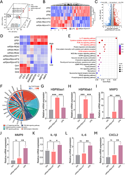 转录组结果分析显示,mPDA纳米粒子的引入加上其介导的多次温和光热疗对于炎性环境下的髓核细胞(NPCs)发挥了双重干预作用,不仅能通过上调热休克蛋白(HSPs)来干预ECM的合成代谢,还能通过清除ROS来下调IL-17和TNF炎性信号通路,从而干预ECM的降解代谢(图3)。