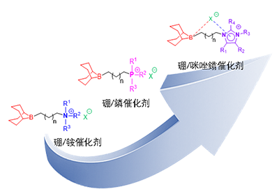 图1. 可模块化设计的有机硼/铵鎓盐、有机硼/鏻鎓盐和有机硼/咪唑鎓盐三类催化剂