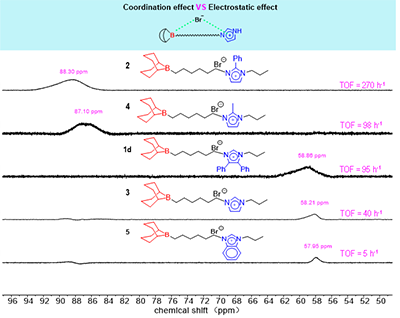 11B NMR化学位移的系统性变化为理解所观察到的催化活性差异提供了直接的光谱依据(图3)。11B NMR分析表明,催化剂活性与其硼中心的化学位移密切相关:活性最高的催化剂2(δ = 88.30 ppm)呈现显著的低场位移,反映出咪唑鎓阳离子通过电子效应显著降低了硼中心的电子密度。催化性能主要取决于取代基诱导的π共轭效应及由此引发的电子重新分布。其中,N-1位孤对电子参与芳香离域,削弱了氮原子的电子密度,并在双功能催化体系中产生跨空间的电子传递效应。