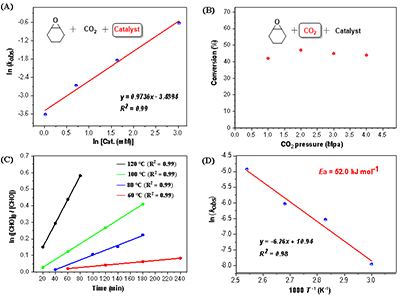 动力学研究表明:反应对催化剂浓度呈一级依赖;对二氧化碳压力呈零级依赖,说明二氧化碳插入非速控步;对环氧化物浓度呈一级依赖;反应表观活化能 (Ea = 52.0 kJ mol-1),与金属催化剂相当(图4)。