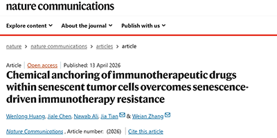 2026年4月13日,相关成果以“Chemical anchoring of immunotherapeutic drugs within senescent tumor cells overcomes senescence-driven immunotherapy resistance”为题发表于国际知名期刊《Nature Communications》。