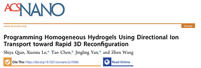 2026410日,相关研究成果Programming Homogeneous Hydrogels Using Directional Ion Transport toward Rapid 3D Reconfiguration为题发表在ACS Nano期刊上。中国科学院宁波材料技术与工程研究所博士后乔士亚为第一作者,陈涛研究员阎敬灵研究员乐晓霞副研究员为共同通讯作者