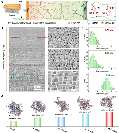 为此,中国科学院宁波材料技术与工程研究所陈涛研究员、阎敬灵研究员和乐晓霞副研究员提出一种实现均质水凝胶在单一刺激下快速变形的新策略。受海星定向离子传输机制启发,本研究通过海水中的定向金属离子传输,设计了一种可实现三维结构成型的超分子聚酰胺酸盐(PAAS)水凝胶。该水凝胶含有高密度羧酸根阴离子,能够在海水刺激下,借助Ca2+/Mg2+与羧酸根之间的不对称交联作用,实现可编程的三维形态构建。此外,PAAS水凝胶的动态超分子网络赋予其优异的可重构性,可支持复杂三维结构的反复重塑。综上所述,该研究利用单一刺激实现了均质水凝胶中三维形态的快速编程,为环境相应性水凝胶提供新的研究思路。