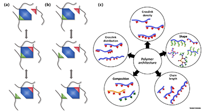 2. (a)(b)动态共价键的结合交换和解离交换;(c)动态聚合物网络中报告的关键架构参数;
