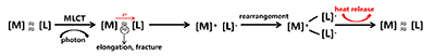 配位键由一个原子(称为配体,通常含孤对电子或π电子)提供电子对给中心原子,本质上属于化学键范畴。配位键的强度介于共价键和范德华相互作用之间,它可以在相当宽的范围内进行调整。配位键在光照刺激下,电子从配体跃迁至金属d轨道,d电子再向配体的π轨道跃迁产生高能热电子。同时,配位键的键长度伸长,光还原驱动导致配位丢失,配位数降低,甚至发生配体的解离,激发态电子主要非辐射弛豫形式实现热能释放。