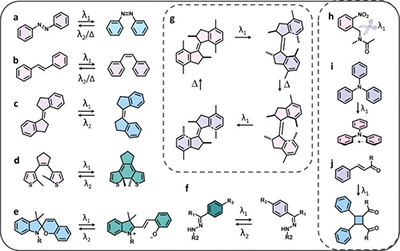 4. 光响应 a偶氮苯,b二苯乙烯,c硬二苯乙烯,d二芳乙烯,e螺吡喃,f基于腙的开关,g分子马达,h可光裂解的邻硝基苄基,i三芳胺衍生物,和j肉桂酸衍生物。