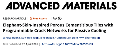 相关研究以Elephant-Skin-Inspired Porous Cementitious Tiles with Programmable Crack Networks for Passive Cooling”为题发表在《Advanced Materials上。共同第一作者Qingya Huang Kun-Hao Yu,后者现为雪城大学助理教授。