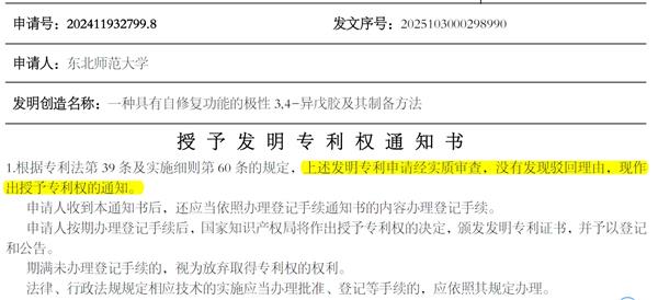 课题组关于自修复功能的异戊橡胶的专利,直接获得国家专利局授权!