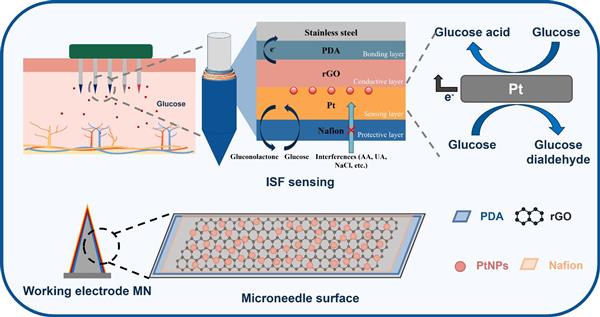 Abstract: Although subcutaneous implanted continuous glucose monitoring (CGM) systems have proven effective in promoting diabetes management, their adoption has been limited because of high production costs and reduced accuracy and precision resulting from their invasive nature. In this research, a biosensor based on a minimally invasive solid microneedle array for continuous glucose monitoring was introduced. The device was consisted of solid metal microneedles integrated with polydopamine (PDA) and reduced graphene oxide (rGO) to immobilize platinum nanoparticles (Pt NPs)s. The geometric features of these microneedles allowed them to penetrate dermal tissue without the need for an applicator. The as-fabricated biosensor has been used for blood glucose detection as a non-enzymatic electrochemical biosensor with a wide detection range of 2-38 mM, high sensitivity of 0.48 μA/mM/cm2 and low detection limit of 0.18 mM. To assess its practical applicability, the efficacy of the biosensor was evaluated on in vivo animal assessment. The results demonstrated a high degree of consistency in blood glucose levels between those detected by the developed microneedle biosensor and the conventional glucometer.