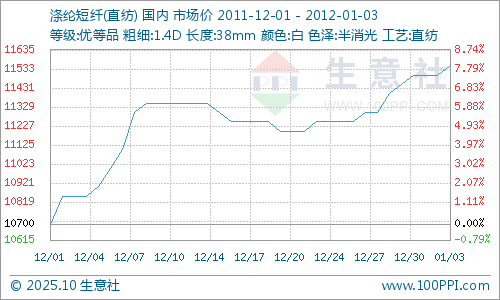 从图中看出,本月(12.01-12.31) 国内涤纶短纤市场走势为盘整向上的趋势。截止月末(浙江涤短市场)1.4D直纺报价在11500元/吨左右与月初初10700元/吨跌幅在7.47%,同比增长-8%。