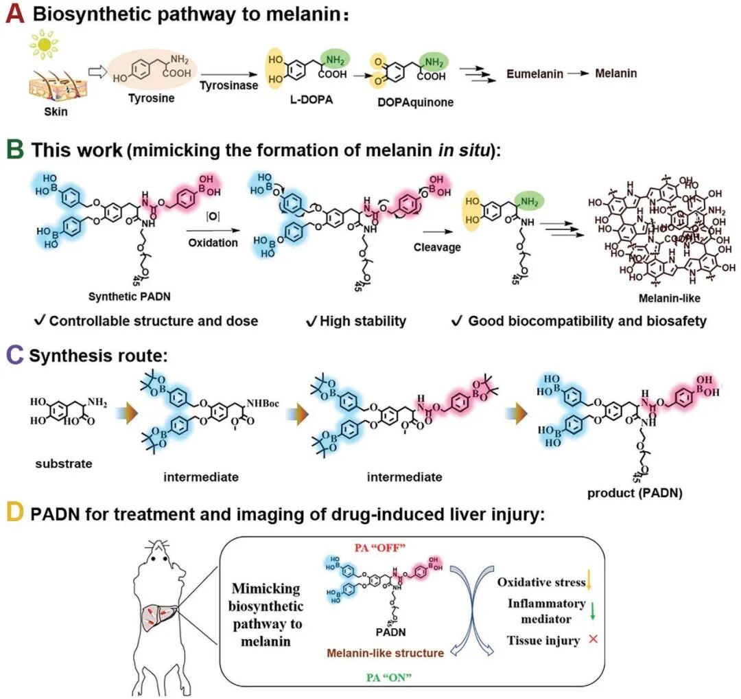 图 1. PADN的设计及作用机理示意图。A) 黑色素的生物合成途径;B) PADN作为酪氨酸模拟物,通过类似于天然酪氨酸的氧化聚合途径来清除自由基;C) PADN的合成路线;D) PADN在药物诱导的急性肝损伤模型中的治疗与成像作用。