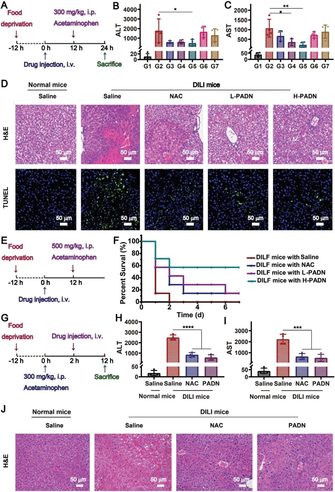 图4. PADN对药物性急性肝损伤和肝功能衰竭的防治作用。A) AILI 小鼠建立和预防时间表示意图;B,C) 不同预处理条件下的 DILI 小鼠血清中ALT和 AST水平;D) 肝组织的 H&E 染色和 TUNEL 染色;E) DILF 小鼠建立和预防示意图;F) DILF 小鼠不同预处理条件下的生存曲线;G) AILI 小鼠的建立和治疗示意图;H,I) DILI 血清中ALT和AST水平;J)肝组织的 H&E 染色。