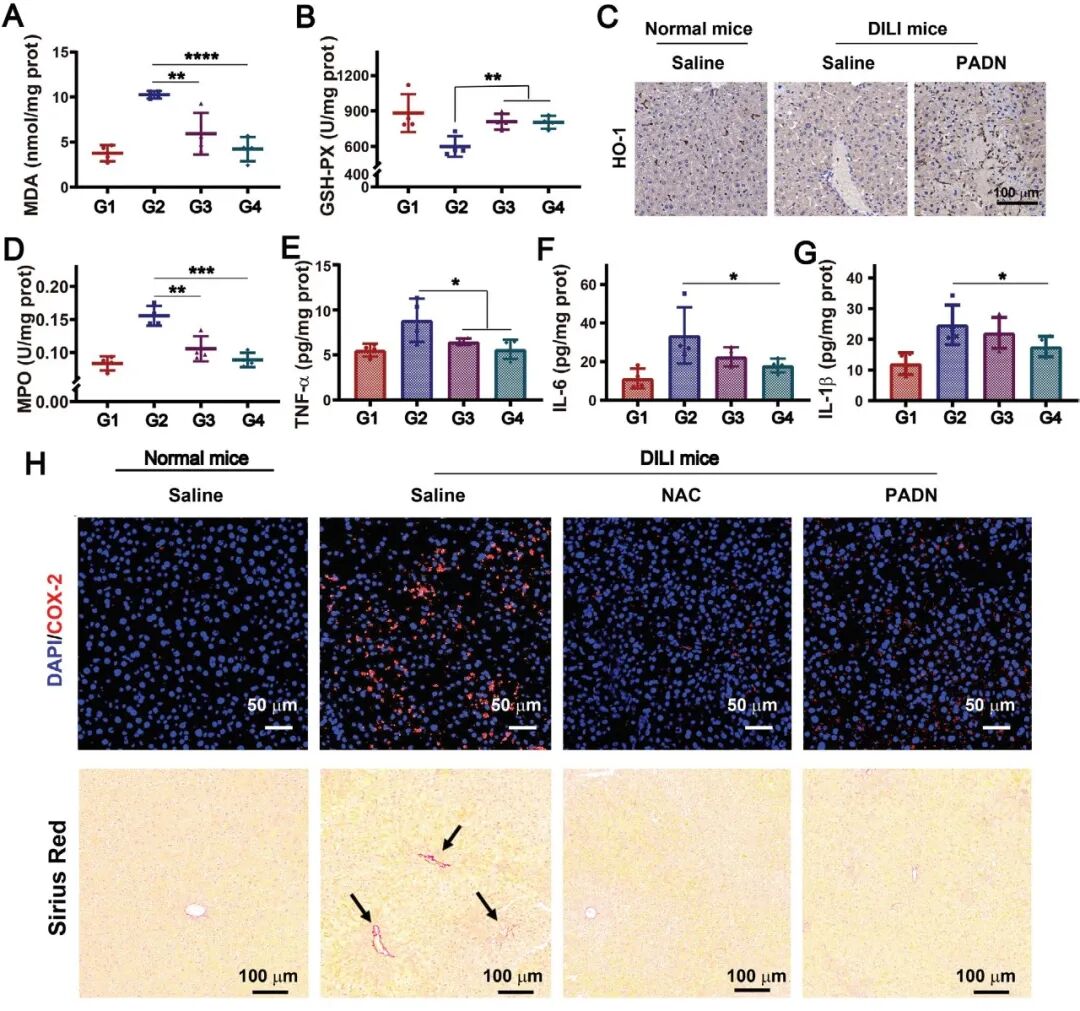图 5. PADN 治疗机制研究。A,B) 肝组织中MDA和GSH-PX水平;C)组织中 HO-1 的免疫组化分析;D) 肝组织中MPO分析;E-G) 肝组织中TNF-α、IL-6和 IL-1β水平;H) 肝组织中 COX-2 的表达和天狼星红染色。