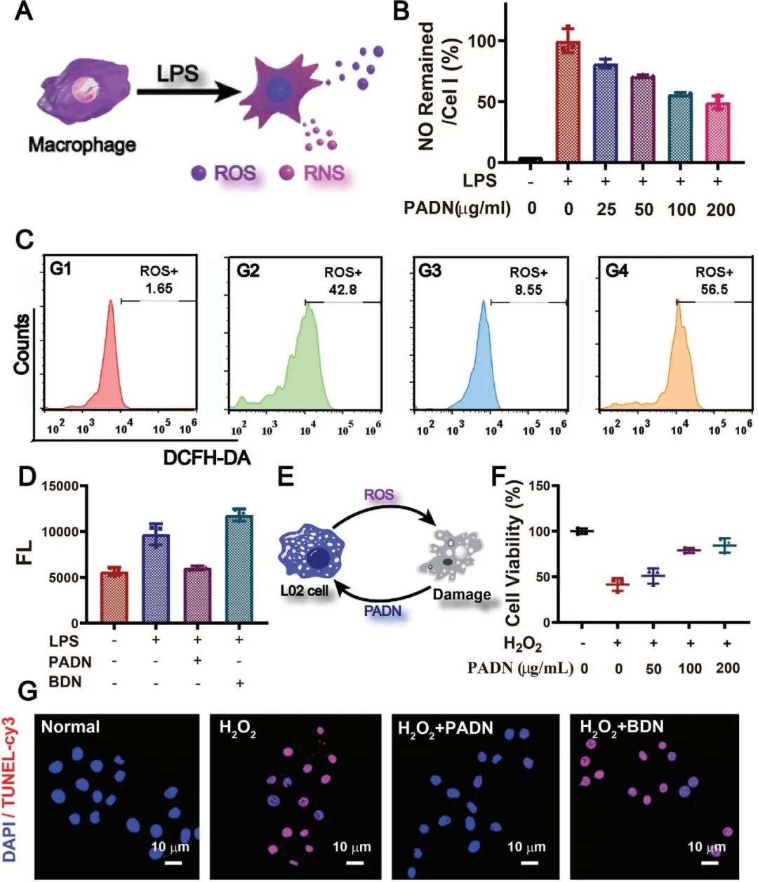 图 3. PADN 的自由基清除和细胞保护活性。A) LPS 刺激后 Raw 264.7 巨噬细胞中活性氧和活性氮物质升高;B) LPS刺激的Raw 264.7巨噬细胞中的 ?NO 含量;C) Raw 264.7 细胞中ROS水平的流式细胞术分析;D) Raw 264.7 细胞中 ROS 水平的定量分析;E) PADN 对L02 细胞的保护机理示意图;F) L02 细胞的细胞活力;G) L02 细胞在不同处理条件下的CLSM 图像。