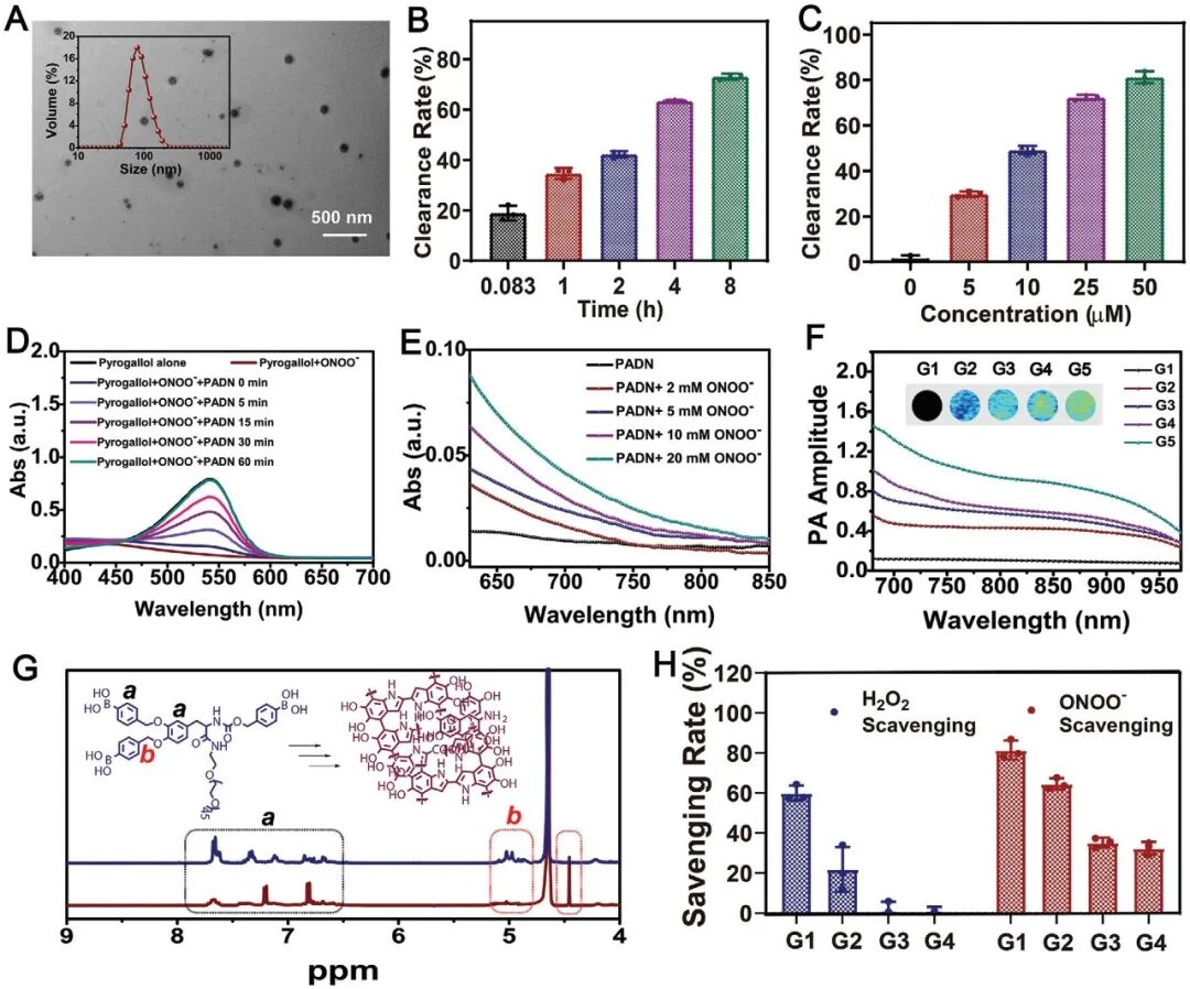 图 2. PADN 及相关材料的合成与表征。A) 透射电子显微镜和动态光散射分布图;B)在不同时间点PADN的 H2O2 清除效果;C) PADN对不同浓度H2O2的清除作用;D) PADN 的 ONOO-清除作用;E) PADN 被氧化后的 UV-vis-NIR 吸收光谱图;F) PADN 被氧化后的PA 光谱和 PA 图像;G) PADN被氧化前后的1H NMR谱图;H) PADN、PEG-Dopa、氧化的PADN和Mel-NPs的ROS清除活性。