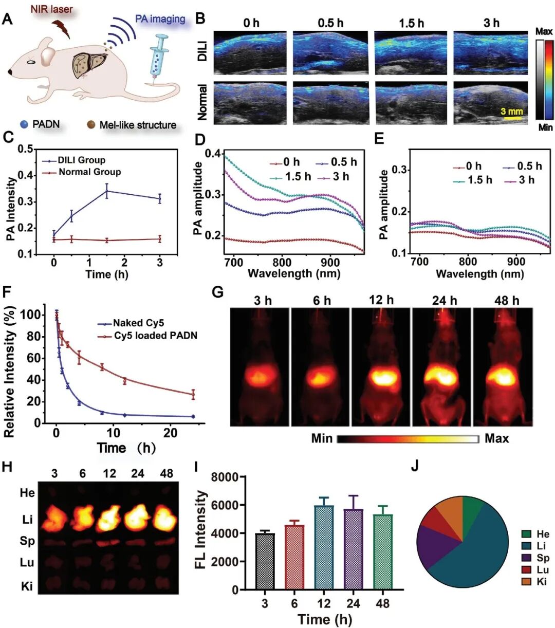 图 6. PADN 的体内 PA 成像、药代动力学和生物分布。A) PA 介导的 DILI 疾病检测示意图;B) DILI 组织和正常肝脏组织的PA 图像;C) 不同组中PA 强度;D) DILI 组织中PADN的PA 光谱;E) PADN 在正常肝组织中的PA光谱;F) 负载Cy5的PADN和Cy5在健康小鼠中的血液循环曲线图;G) 负载IR 1061的PADN在健康小鼠中的NIR-II 荧光成像;H) 负载IR 1061的PADN在不同器官中的离体生物分布;I) 肝脏中 PADN 生物分布的半定量分析;J) 注射12小时后不同器官中PADN生物分布的半定量分析。