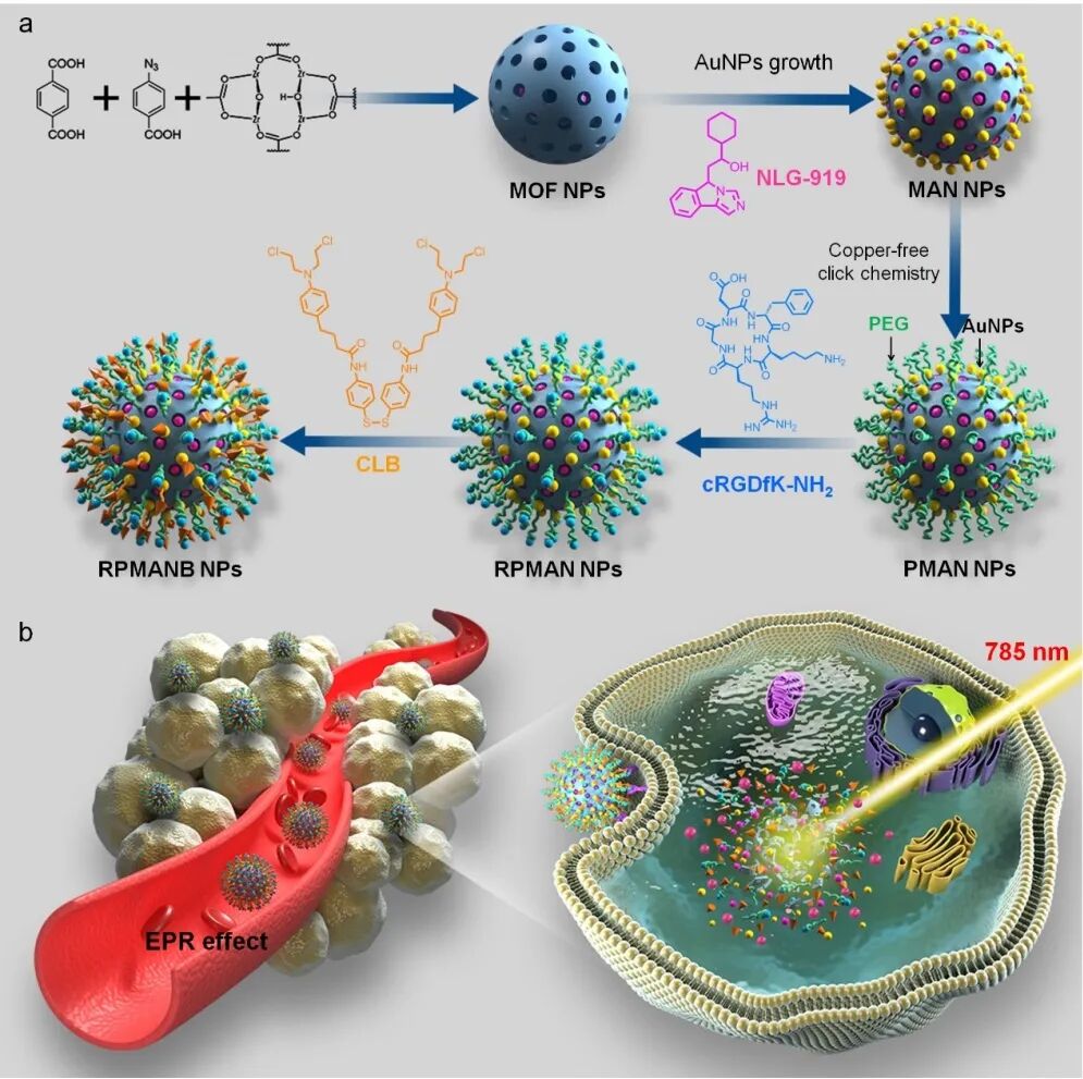 以此为基础,团队利用金纳米(AuNP)对有机金属骨架(MOF)进行原位杂化,获得可同时搭载化疗药物和IDO抑制剂的纳米载体。同时使用聚乙二醇和cRGDfK多肽对载体进行结构修饰,使其具备高度的血循环稳定性和肿瘤靶向特异性,使载有抗肿瘤药物的纳米载体可以持续、稳定、精准地投递到肿瘤部位,并进行富集。再利用近红外光对肿瘤部位药物进行光控激活,实现药物的二级靶向。