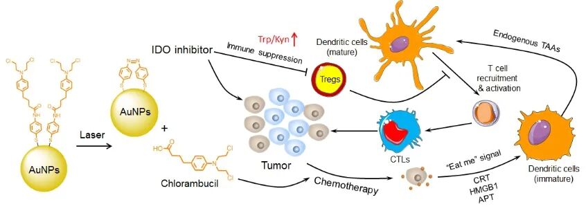 肿瘤免疫治疗是近年来新兴的肿瘤治疗方式,但仅有小部分病人对免疫治疗有反应。由于肿瘤免疫原性较弱,很难引起强烈免疫杀伤反应,这是肿瘤逃避机体免疫监视、免疫治疗效果不佳的重要机制。化疗药物可诱导肿瘤细胞强烈、持续的免疫原性死亡(ICD),可以将免疫学上“冷”的肿瘤转化为由损伤相关介导的“热”肿瘤,从而增强免疫治疗的有效率。此时,再利用吲哚胺2,3-双加氧酶(IDO)抑制剂,抑制必需氨基酸色氨酸(Trp)到犬尿氨酸(Kyn)的酶促转化,可以进一步促进肿瘤特异性效应T细胞的增殖和活性,从而显着地提高化疗的疗效。两者相辅相成、相互促进,可以实现对肿瘤的联合打击。