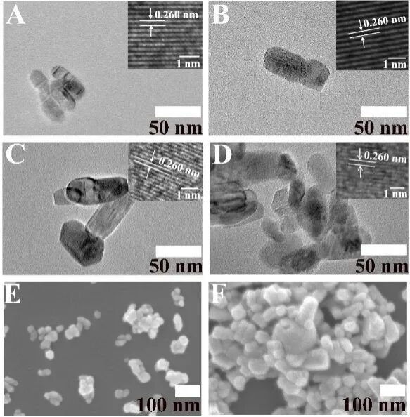 图2 GaχZn1 ? χO纳米粒子的TEM和SEM图像。透射电镜图像(A) χ= 0, (B) χ= 0.025, (C) χ= 0.050, (D) χ= 0.075,扫描电镜图像(E) χ= 0.025, (F) χ= 0.050。
