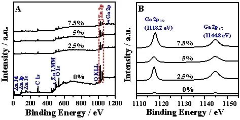 图1 对GaχZn1 ? χO纳米粒子的XPS分析。(A) GaχZn1 ? χO纳米粒子的XPS测量扫描 (B) GaχZn1 ? χO纳米粒子在Ga 2p3/2 and Ga 2p1/2.的窄XPS扫描