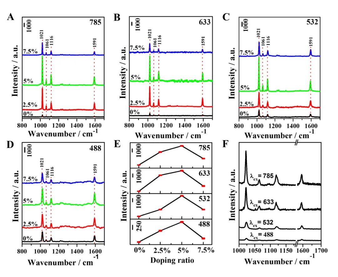 图4 (A) 785, (B) 633, (C) 532和(D) 488 nm下GaχZn1?χO/MPy的SERS光谱。 (F) GaχZn1?χO/MPy (χ = 0.050)复合物在785、633、532和488 nm不同激发线下的SERS光谱。