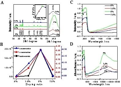 Ga掺杂ZnO NPs的XRD谱图显示,除ZnO峰外,没有观察到Ga2O3或其他杂质的衍射峰,进一步说明合成的掺杂纳米粒子结晶良好,没有其他结晶相,并且成功地将Ga3 离子掺杂到ZnO晶格中。红外光谱与紫外-可见-近红外光谱的结合结果显示Ga掺杂ZnO纳米粒子在可见光-近红外范围内表现出强烈的SPR吸收,纯ZnO NPs没有明显的SPR吸收。