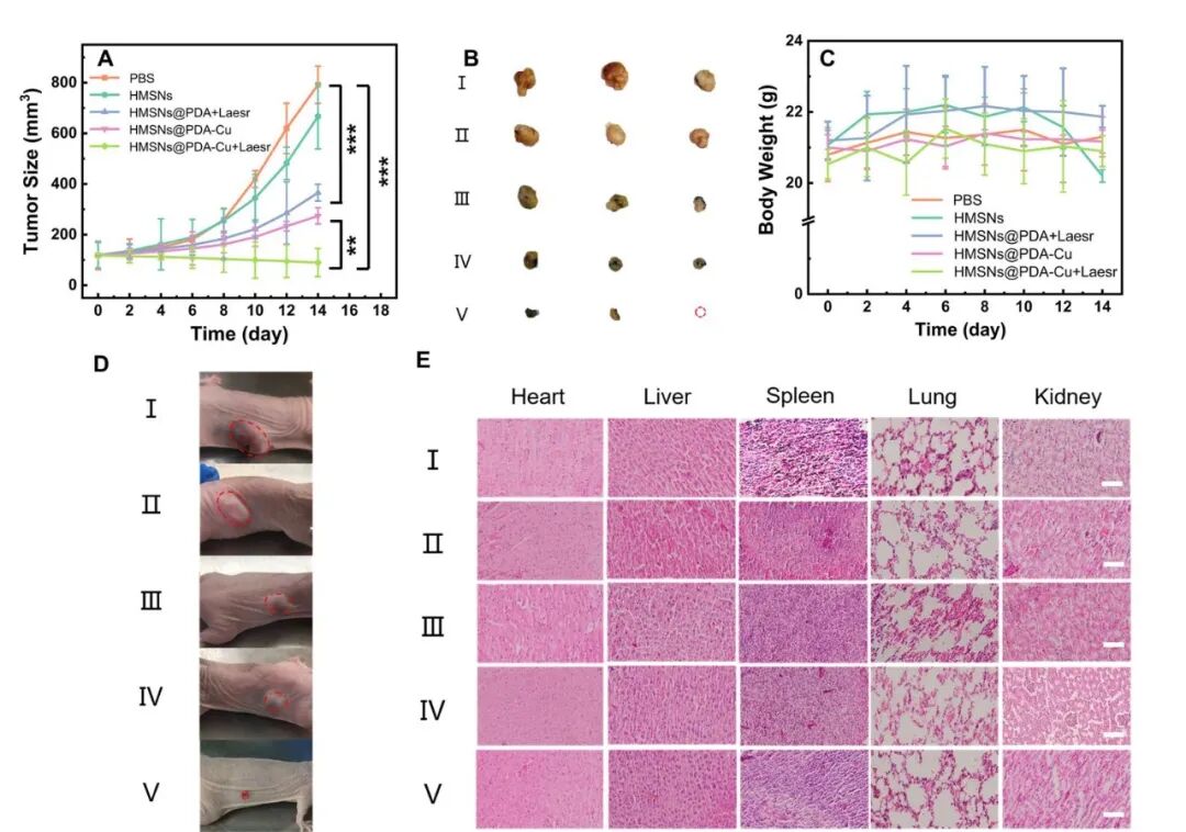动物水平的抗肿瘤治疗效果如图7。在带肿瘤的裸鼠模型皮下注射HMSNs@PDA-Cu-2,14天后观察治疗效果。HMSNs@PDA-Cu-2可有效抑制肿瘤生长。苏木精染色结果表明不同治疗条件下,主要器官都能保持良好的细胞形态学。