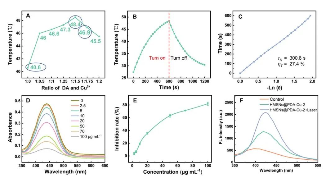 图5 (A) 不同组成比例的 HMSNs@PDA-Cu-2经808nm的激光照射10min后达到的温度; (B、C) HMSNs@PDA-Cu-2的光热转化效率; (D) 通过WST法检测HMSNs@PDA-Cu-2的超氧化物歧化酶活性; (E) HMSNs@PDA-Cu-2对WST formazan生产的抑制; (F) TA检测不同条件下?OH的产生。