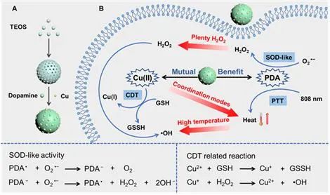 图1 (A) HMSNs@PDA-Cu的制备路径; (B) HMSNs@PDA-Cu经808 nm激光照射后的协同治疗机制。