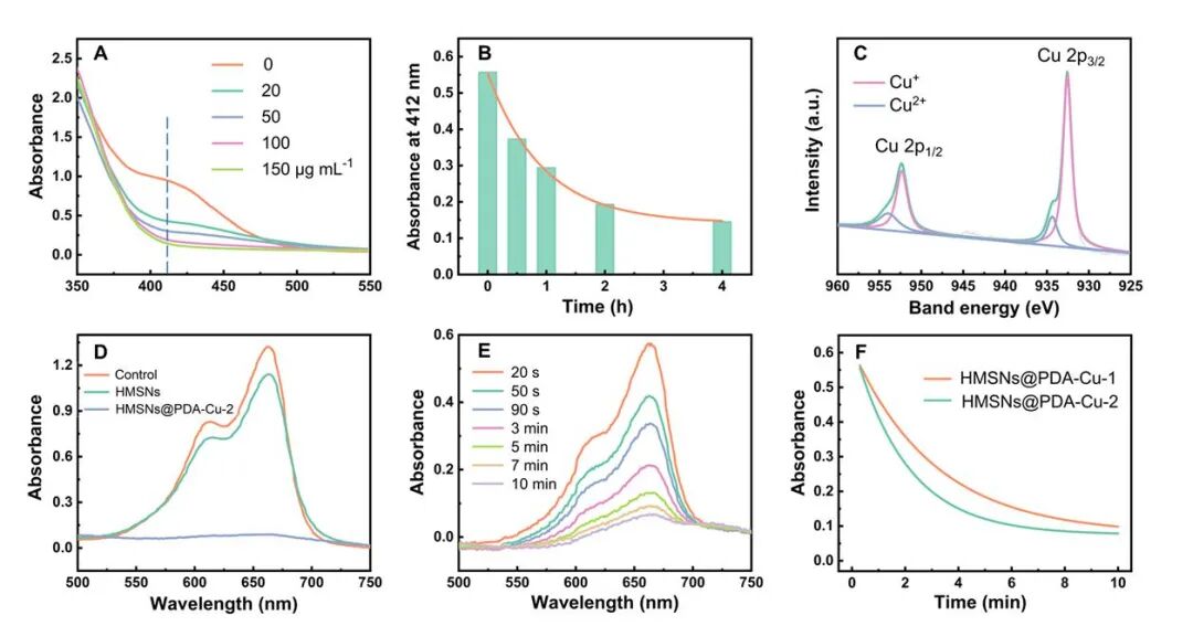 图4 (A、B) DTNB作为探针检测GSH; (C) GSH处理后的HMSNs@PDA-Cu的Cu 2p谱图; (D) 通过亚甲基蓝的降解检测生成的?OH; (E) HMSNs@PDA-Cu-2在不同时间内产生的?OH对亚甲基蓝的降解; (F) HMSNs@PDA-Cu-1和 HMSNs@PDA-Cu-2对亚甲基蓝的降解。