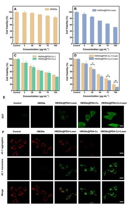不同情况下HMSNs@PDA-Cu对MCF-7癌细胞的毒性及促进细胞内产生?OH的能力如图6。体外的PTT/CDT协同效应对癌细胞的毒性最大,且HMSNs@PDA-Cu-2的治疗效果优于HMSNs@PDA-Cu-1。基于HMSNs@PDA-Cu-2进行的后续实验表明其可促进细胞内羟基自由基的产生,同时破坏线粒体膜电位。