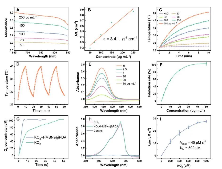 图3 HMSNs@PDA的(A) 吸收光谱; (B) 质量消光系数; (C) 光热效应表征; (D) 光热稳定性; (E) 通过WST法检测HMSNs@PDA的超氧化物歧化酶活性; (F) HMSNs@PDA对WST formazan生产的抑制; (G、H) HMSNs@PDA催化O2及H2O2的产生; (I) HMSNs@PDA的米氏常数。