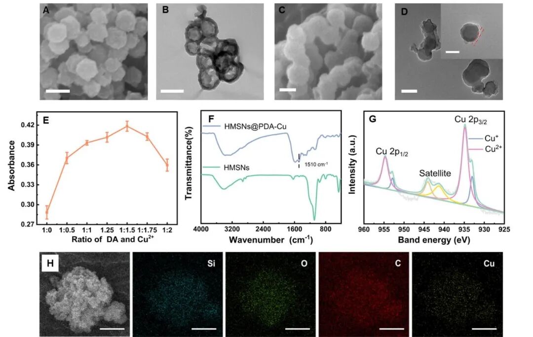 图2 (A、B) HMSNs@PDA的SEM和TEM图像; (C、D) HMSNs@PDA-Cu的SEM和TEM图像; (E) 不同投料比的HMSNs@PDA-Cu在808nm处的吸光度; (F) HMSNs和HMSNs@PDA-Cu的FT-IR光谱; (G) HMSNs@PDA-Cu的Cu 2p谱图; (H) HMSNs@PDA-Cu的SEM图像和元素Mapping结果。