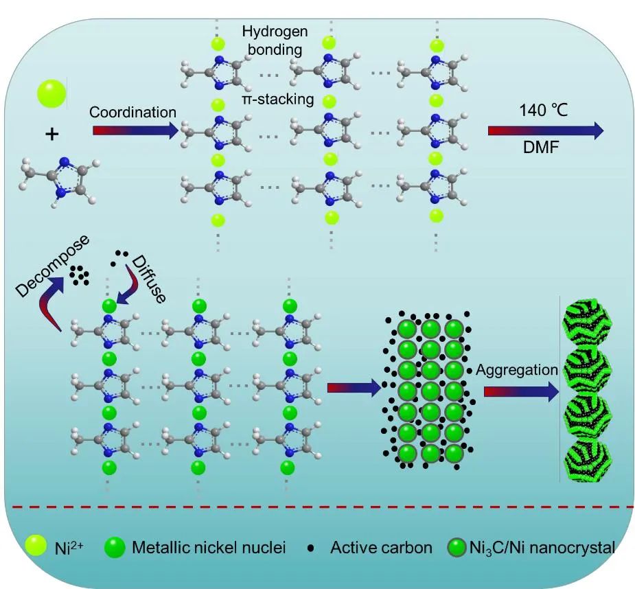 在上述物理表征分析的基础上,他们对合成机理进行了推测(图2):(1) Ni2 与2-甲基咪唑通过配位作用形成一维链状聚合物(Ni2 -2-MIM)n,同时,相邻Ni2 -2-MIM单元上咪唑环之间的N和π-堆积使(Ni2 -2-MIM)n聚合物形成超分子网络。(2) 在溶剂热条件下,具有还原性的DMF溶剂分子将Ni2 还原为金属Ni。(3)金属Ni核进一步催化2-MIM配体的分解,生成大量的化学活性碳(C)原子,C原子与Ni核表面的Ni原子反应生成Ni3C。 (4)相邻的一维Ni3C/Ni纳米复合材料聚集在一起,最终形成具有Ni3C和Ni间隔的链状纳米材料。
