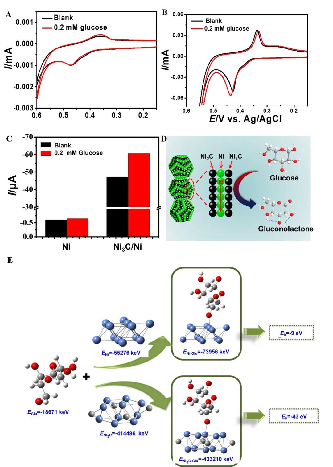 图3. Ni-CS/GCE (A) and Ni3C/Ni-CS/GCE (B) 对葡萄糖电催化氧化的循环伏安图及相应的峰电流变化柱状图(C)。D为推测的电化学反应机理。E为Ni3C和Ni与葡萄糖分子的结合能理论计算结果比较。