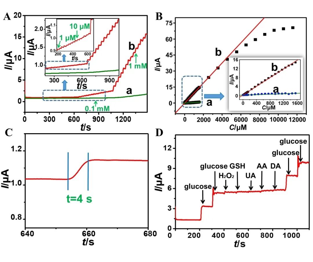 图4. (A) Ni-CS/GCE (a) 和 Ni3C/Ni-CS/GCE (b) 检测葡萄糖的计时安培曲线,及(B)对应的工作曲线.(C)响应时间及(D)抗干扰实验