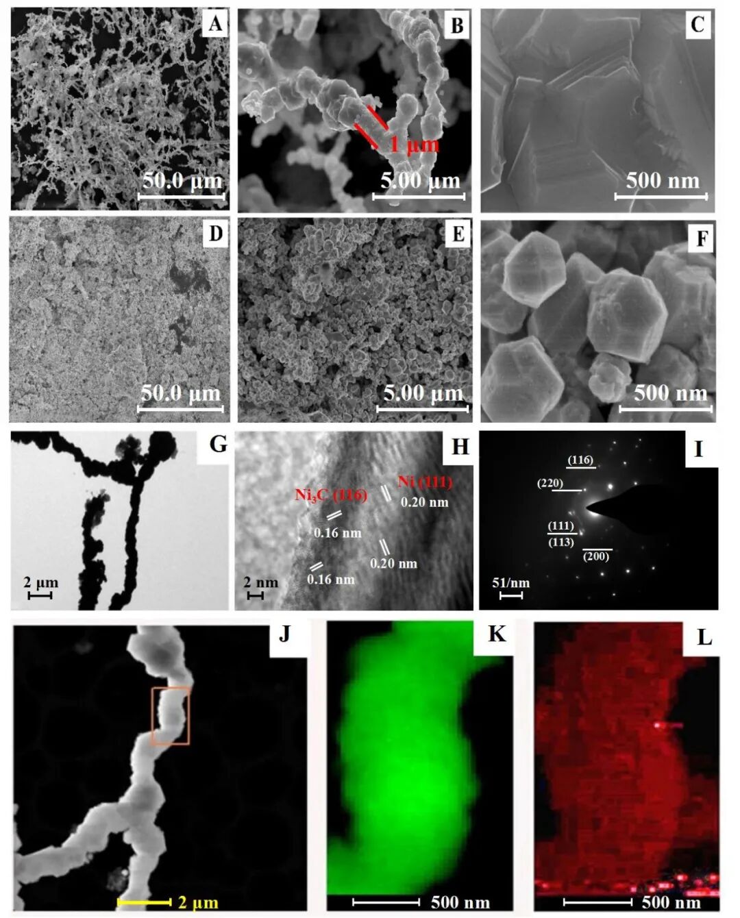 图 1. Ni3C/Ni 纳米链(图A-C)和单独Ni多面体 (图D-F)的扫描电镜图;Ni3C/Ni 纳米链的透射电镜图 (G)、高分辨透射电镜(H)、电子衍射图(I)、元素分析图(J-L)。